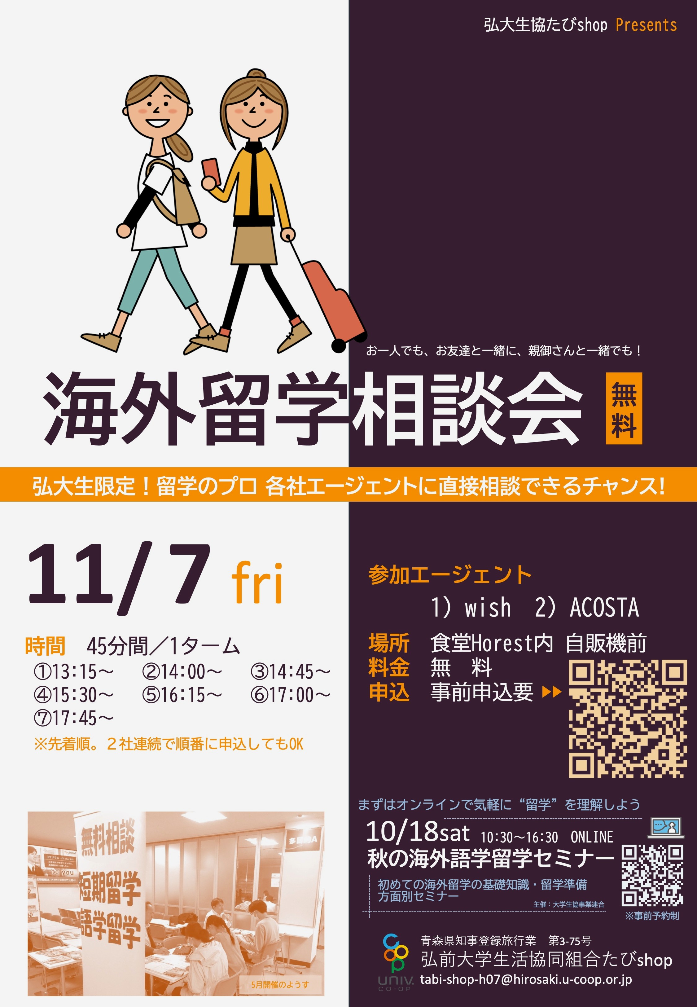 弘前大学生協では、2025/11/7(金)「海外語学留学相談会」を開催いたします。