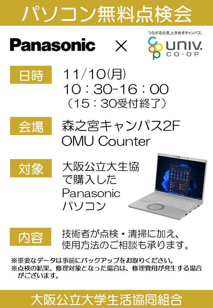 大阪公立大学生協では、大阪公立大学生協で購入されたPC対象に無料点検会を開催いたします。 開催日時:2025/11/10(月)10:30~16:00(※15:30受付終了) 開催会場:森之宮キャンパス2F OMUCounter 対象:大阪公立大学生協で購入したPanasonicパソコン 内容:技術者が点検・清掃に加え、使用方法の相談も承ります。 詳しくはこちらまたは以下をご参照ください。