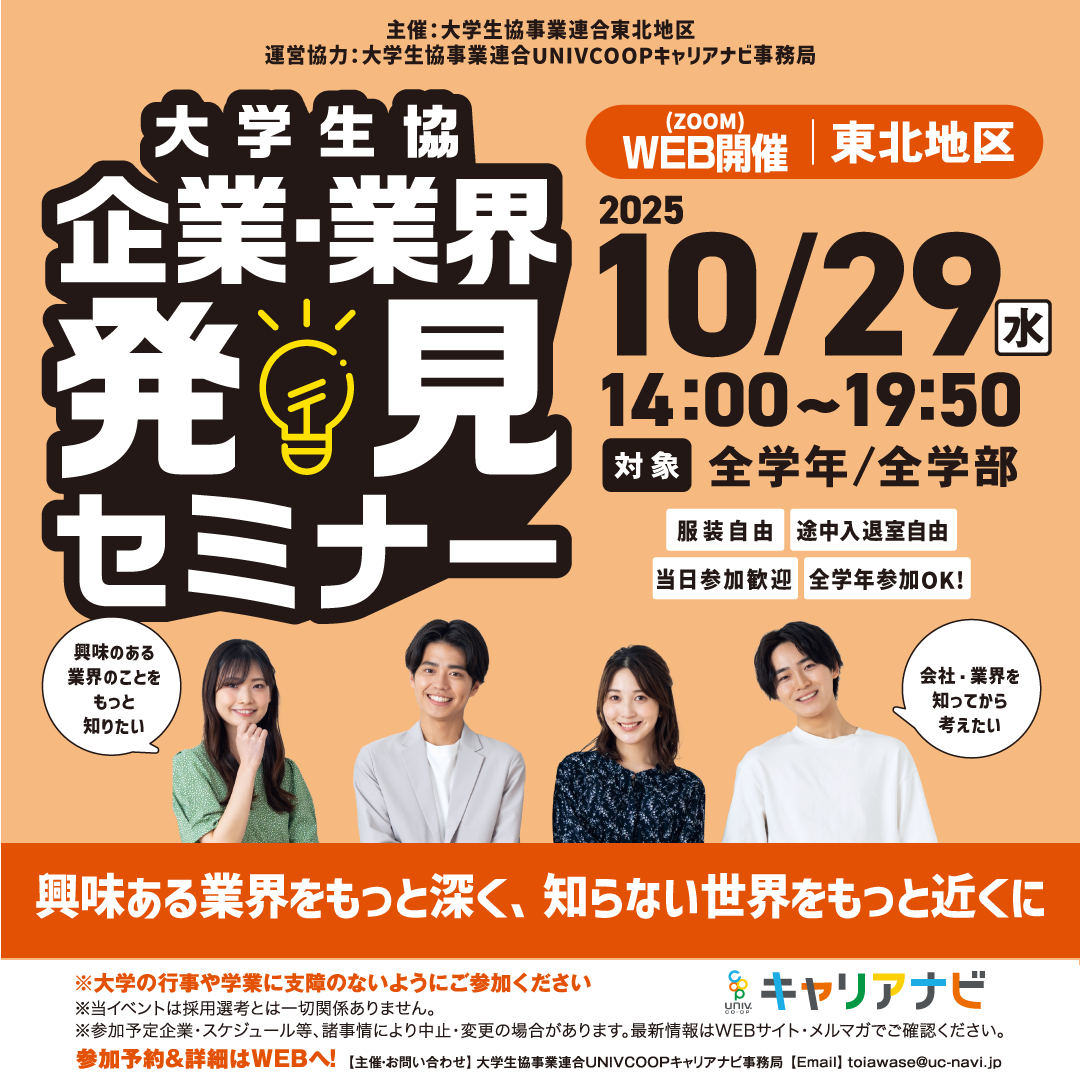 大学生協(東北地区)では、企業・業界発見セミナーを2025/10/29(水)に開催いたします。 開催日:2025/10/29(水) 開催時間:14:00~19:50 対象:全学年/全学部 参加方法:Zoom コンテンツ/トピック