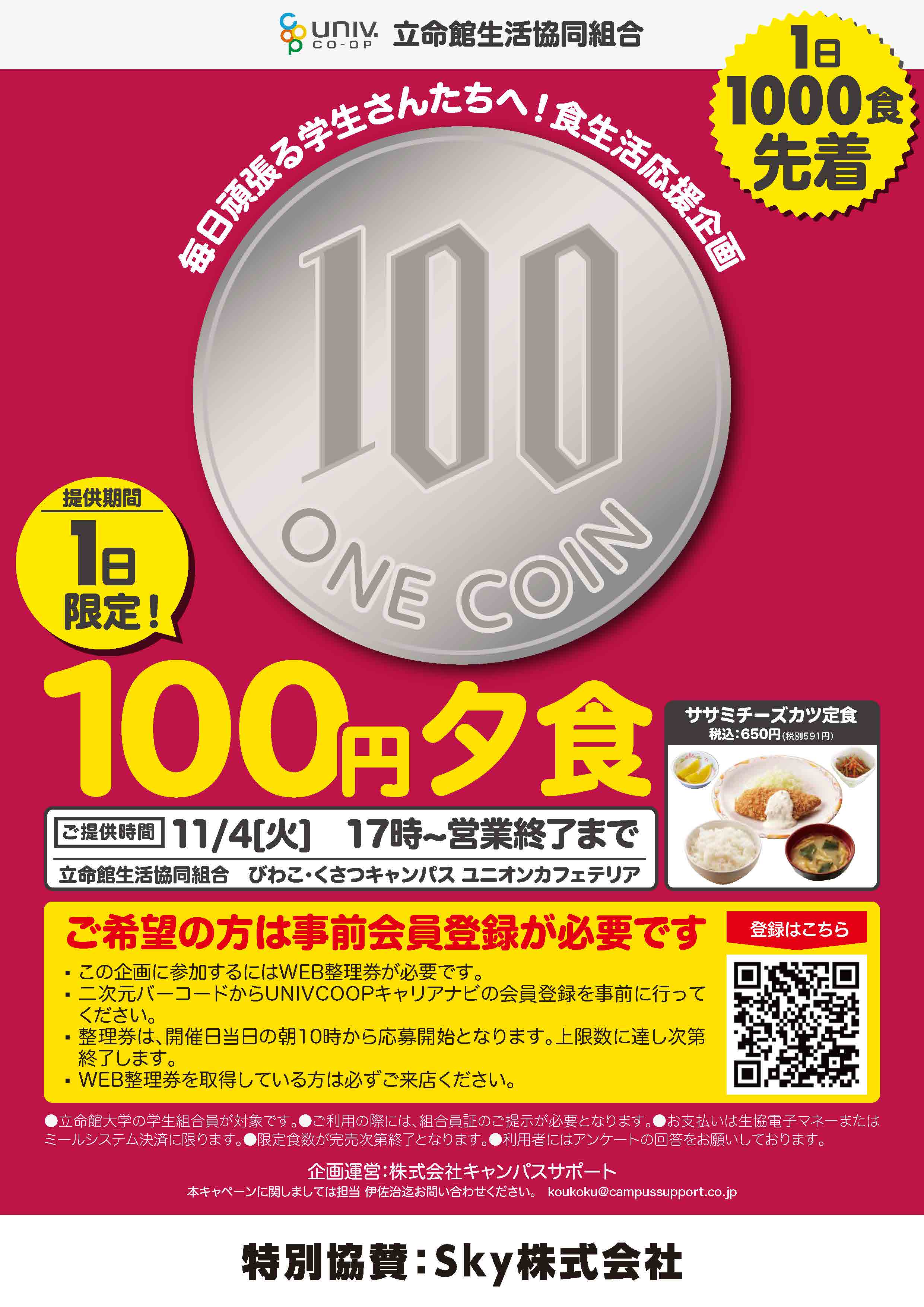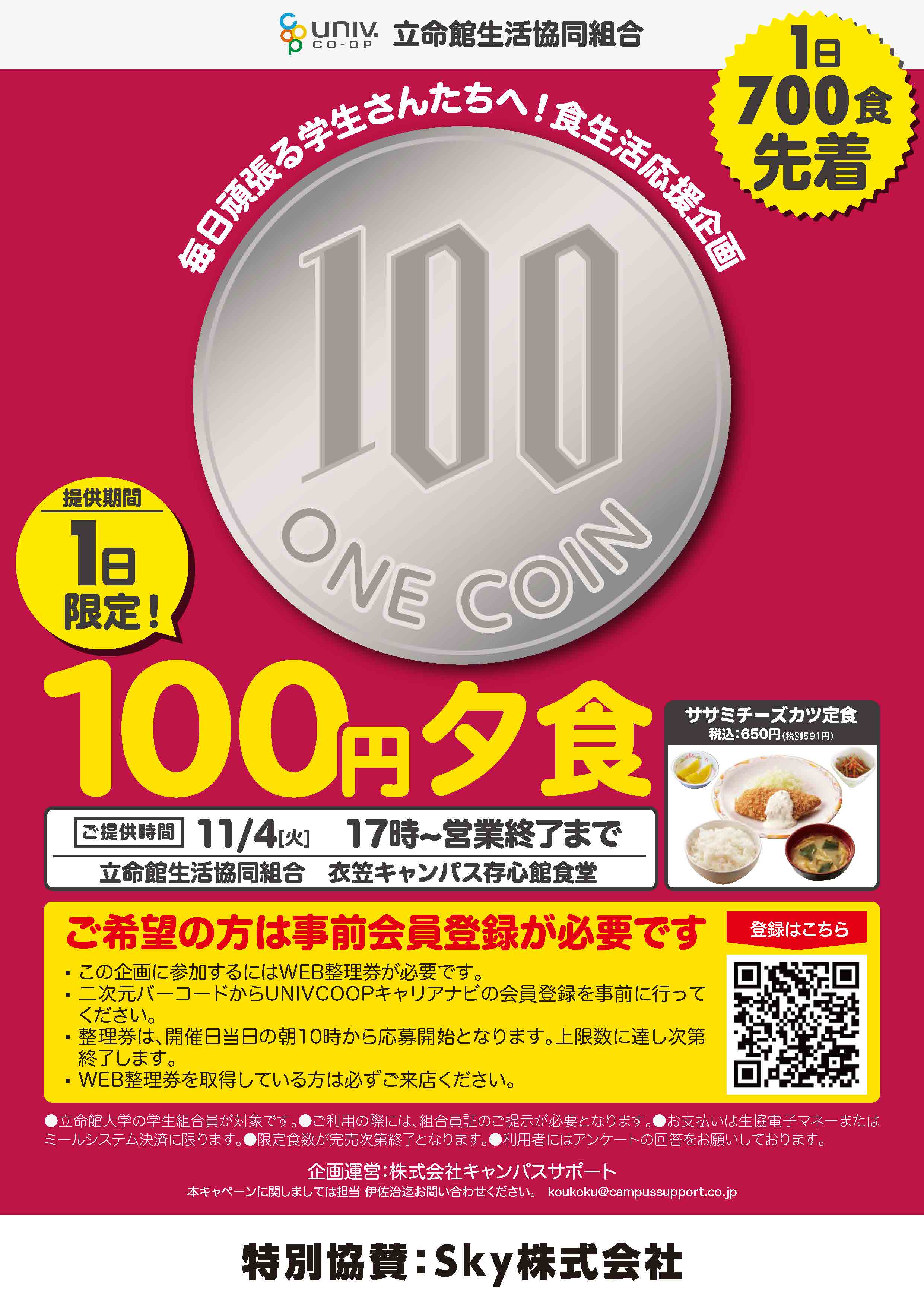 立命館生協では組合員を対象に11/4(火)限定100円夕食を実施いたします。