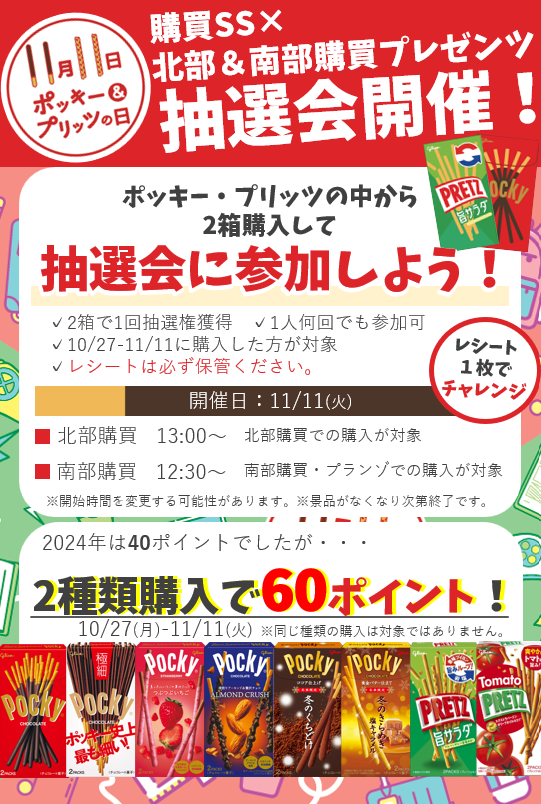※北部購買の抽選会は北部購買での購入、南部購買の抽選会は南部購買・プランゾでの購入が対象です。