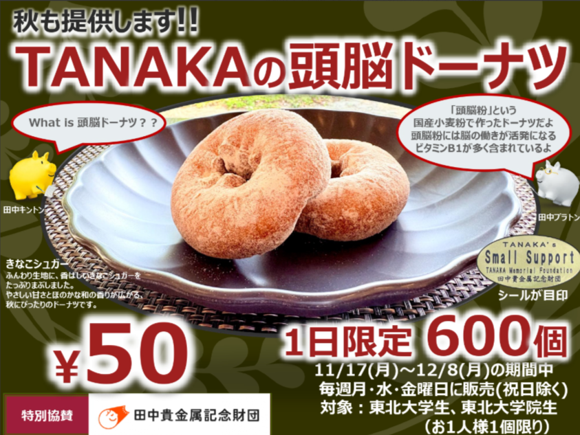 東北大学生協では、大人気の「学生応援TANAKAの頭脳ドーナッツ」を