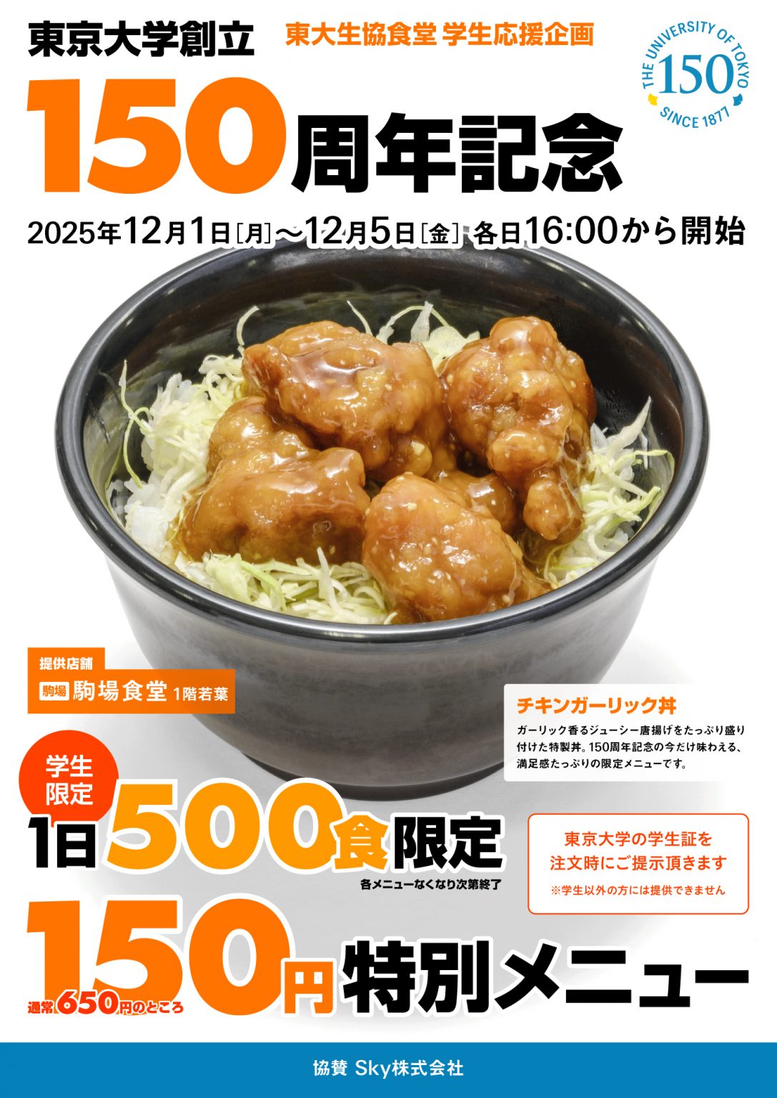東京大学生協より、「東京大学創立150周年記念」東大生協食堂学生応援企画のお知らせです。
