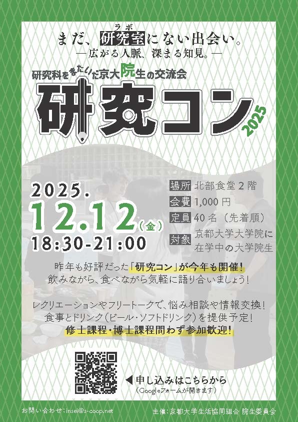 京都大学生協では、大学院生の交流イベント「研究コン」を2025年12月12日(金)北部食堂2階で開催いたします。