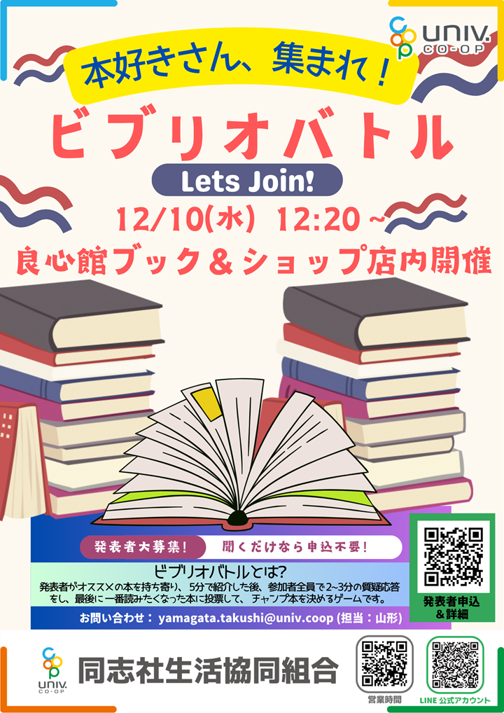 同志社生協では、「ビブリオバトル」を2025年12月10日(水)に開催いたします。