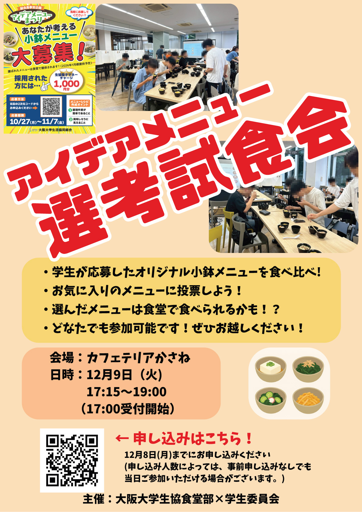 大阪大学生協では、アイデアメニュー祭り選考試食会の参加者を募集しておりますのでお知らせいたします。