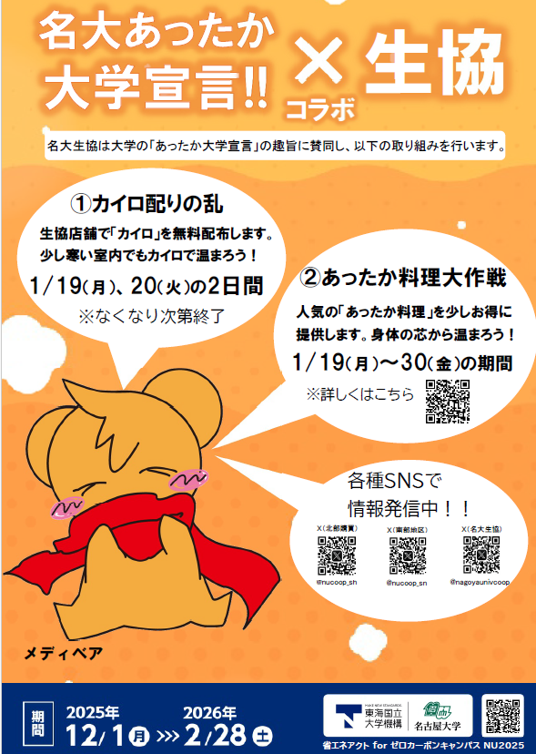名古屋大学生協では、名古屋大学の「あったか大学宣言」の趣旨に賛同し、