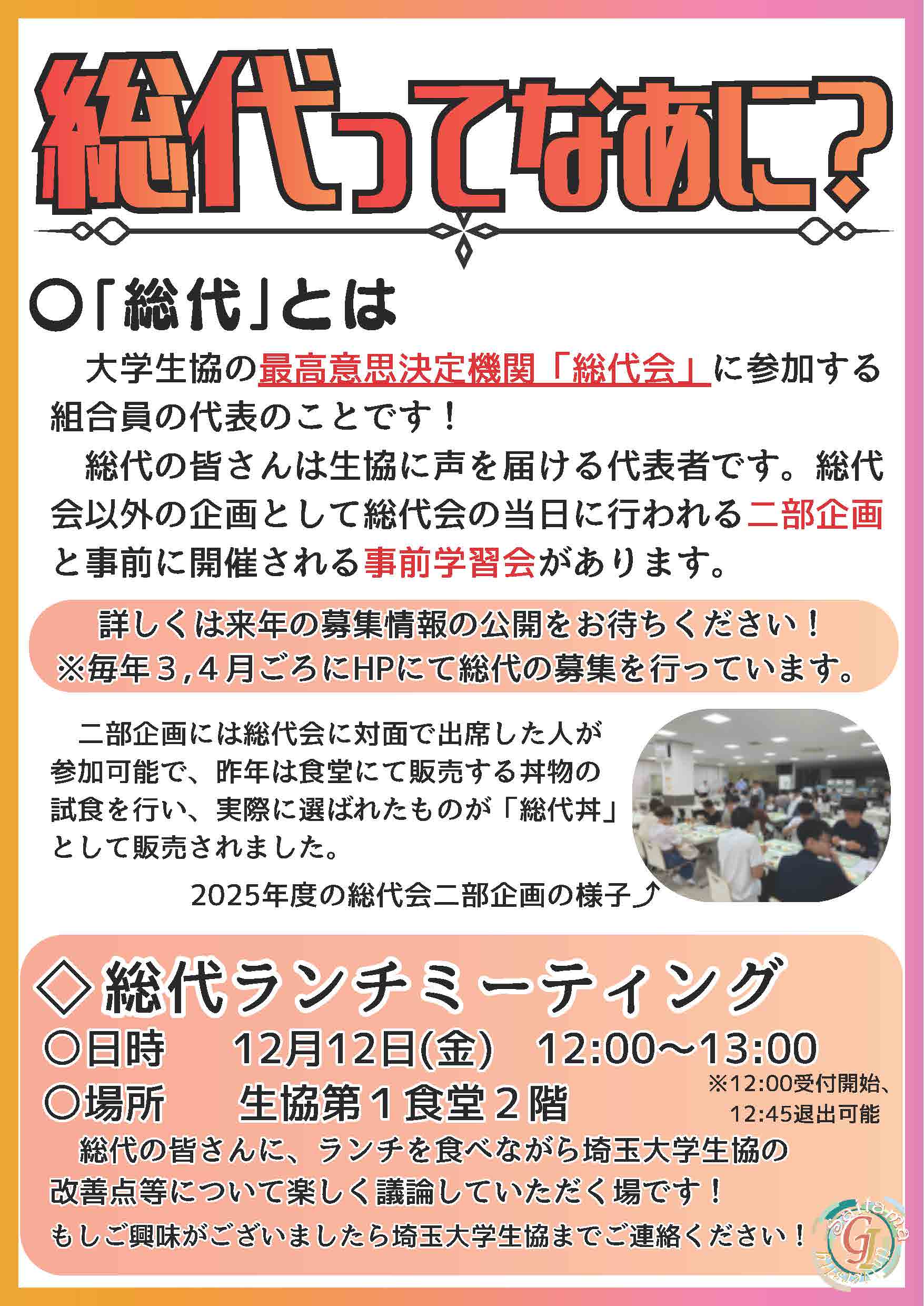 埼玉大学生協では、「総代ランチミーティング」を開催いたします。
