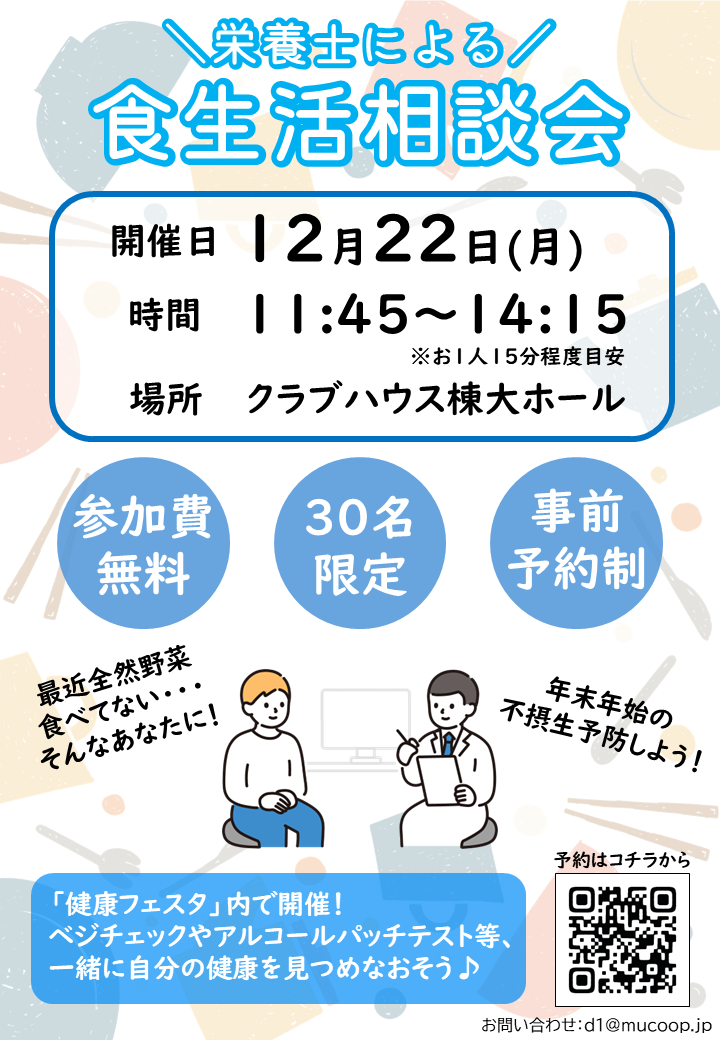 2025年12月22日(月)11:45~14:15限定で、栄養士さんによる食生活相談会が行われます!