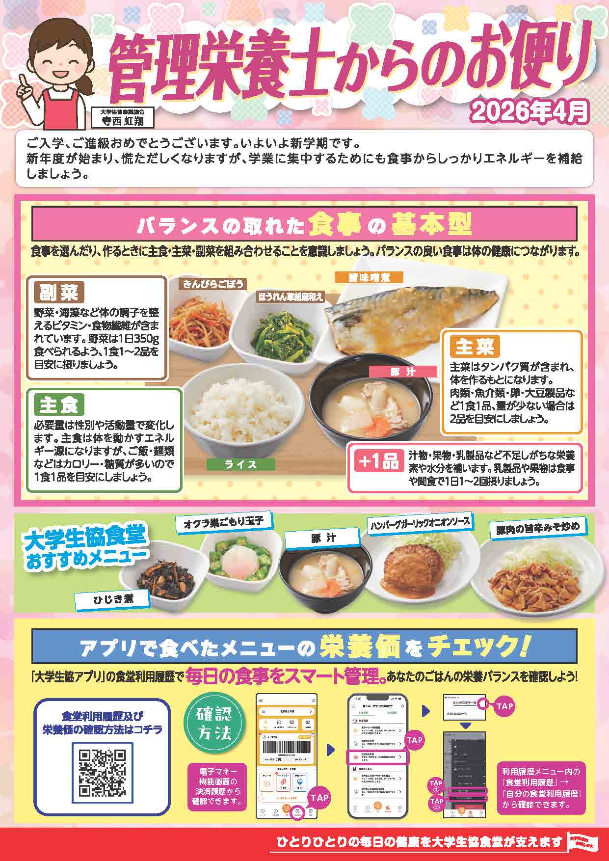 大学生協 「管理栄養士からのお便り」(2026年4月)のお知らせです。 ※中国・四国地域の大学生協を除く ご入学。ご進学おめでとうございます。いよいよ新学期です。 新年度が始まり、慌ただしくなりますが、学業に集中するためにも食事からしっかりエネルギーを補充しましょう。 皆様のご利用お待ちしております。