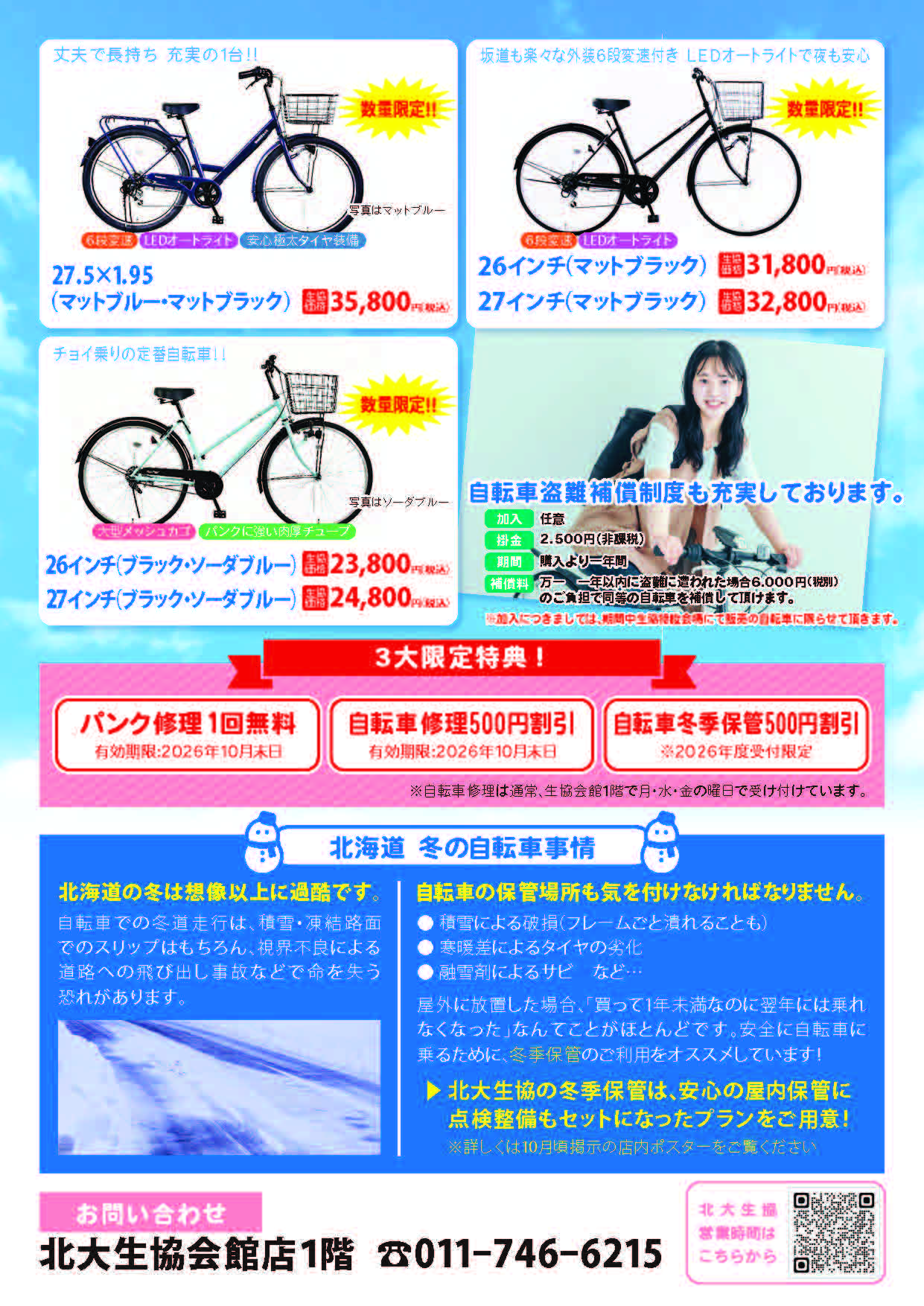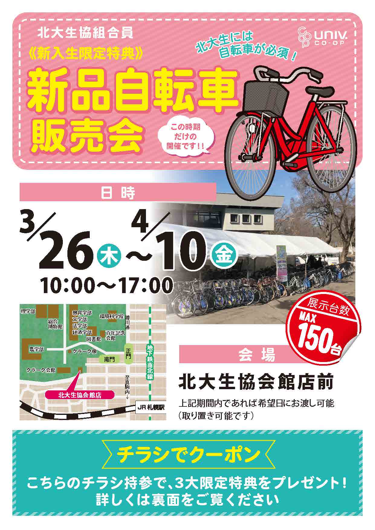 北海道大学生協では、北大生協組合員《新入生限定特典》新品自転車販売会を開催いたします。 ◎2026/3/26(木)~4/10(金) 10時~17時 ※この時期だけの開催です。 チラシ等々はこちらをご覧下さい。