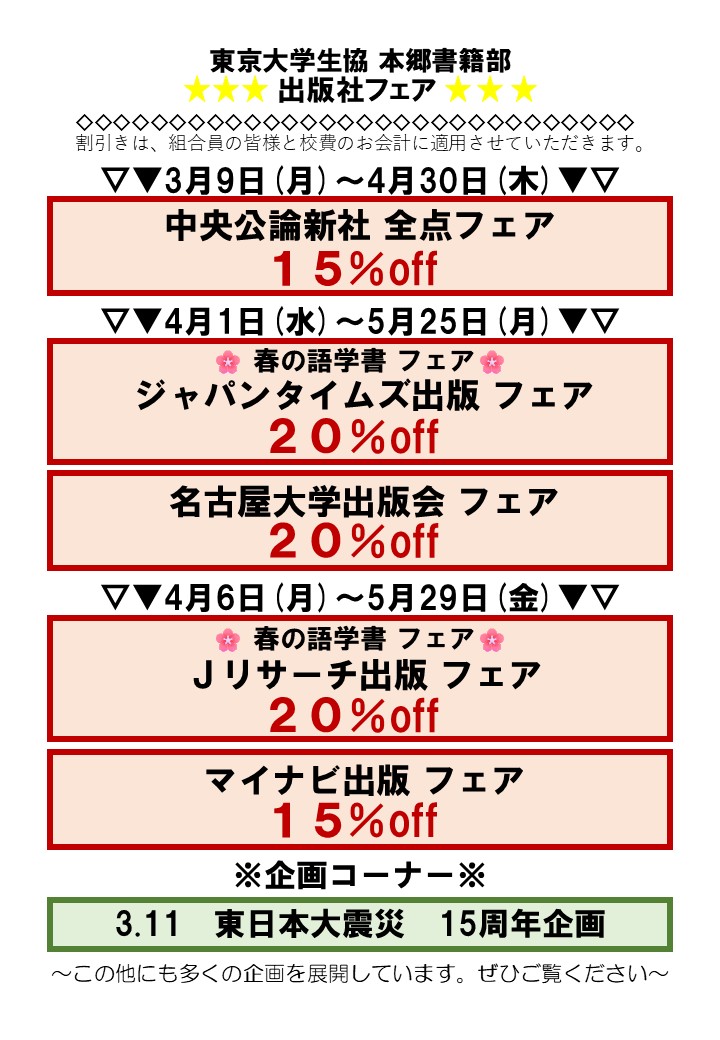 東京大学生協より2026春「本郷書籍部フェアのお知らせ」です。
